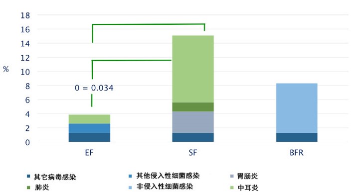 注:MFGM實(shí)驗(yàn)配方(EF)、標(biāo)準(zhǔn)配方(SF)和母乳對(duì)照(BFR)等3組嬰兒6月齡中感染發(fā)生的比較。證明MFGM可有效提高嬰兒免疫力,抵抗病菌感染。