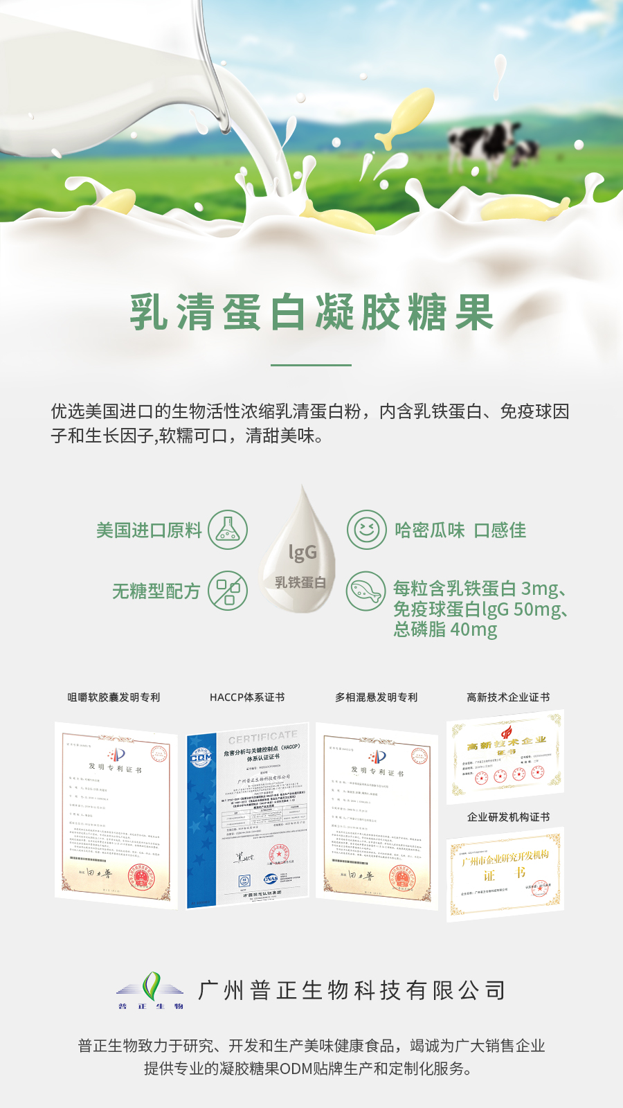 普正乳清蛋白凝膠糖果,將有效乳鐵蛋白內含于Q彈爽口的凝膠糖果之中,奶
