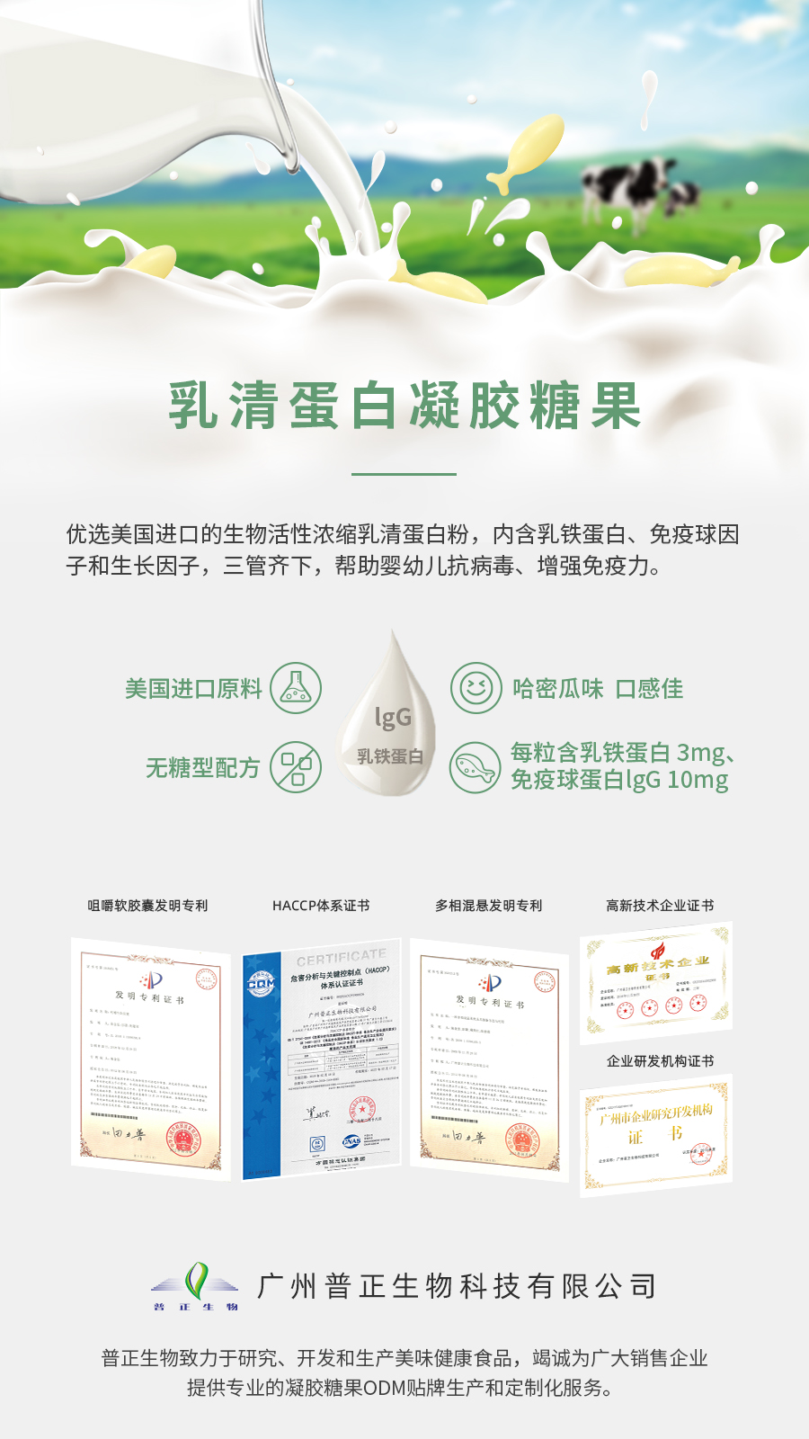 我們研發(fā)的乳清蛋白凝膠糖果,可愛的小魚形狀,蜜瓜牛奶口味,一粒含有3毫克的乳鐵蛋白和約10毫克的免疫球蛋白IgG,運(yùn)用普正自有的iChew技術(shù)進(jìn)行深加工,令其咀嚼起來(lái)口感更細(xì)膩軟糯,內(nèi)容物粒徑達(dá)到數(shù)十微米級(jí)別更利吸收,天然貼合寶寶的營(yíng)養(yǎng)需求,讓寶寶喜歡吃,放心吃,健康吃!